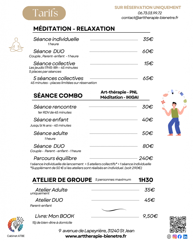 Découvrez les formules tarifaires, conçues pour vous accompagner avec l’art-thérapie, la méditation, la PNL & l’Ikigai